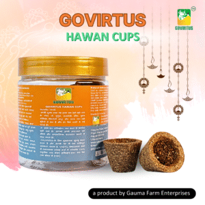 GOVIRTUS Havan Cups are made from the sacred Panchagavya of Himalayan Badri cows (cow dung, milk, curd, ghee, and gomay), blended with deodar wood powder and more than 30 divine herbs like guggul, jatamansi, kapoor bhimseni, kokila, and other Ayurvedic botanicals. When lit, each cup creates the effect of a complete havan, purifies the air, eliminates harmful microbes, and fills the surroundings with a pleasant, calming fragrance.