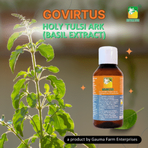 GOVIRTUS Tulsi Ark is prepared from the leaves, stem, roots, flowers, and seeds of Shyama Tulsi, known for its potent medicinal properties. Rich in compounds like Eugenol, Thymol, and Methyl Chavicol, it naturally boosts immunity, protects against infections, and promotes overall well-being. Cultivated under natural conditions at Gauma Farm with the nourishment of Badri cow dung and urine bio-fertilizer, this Tulsi Ark ensures authenticity and purity. It carries the natural aroma and goodness of Tulsi without any artificial colors or chemicals.