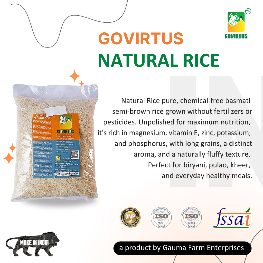 Govirtus Natural Rice is unpolished basmati semi-brown rice, grown without chemicals or pesticides. Packed with natural vitamins, minerals, and micronutrients, it offers a healthy, aromatic, and flavorful option for everyday meals and special dishes.