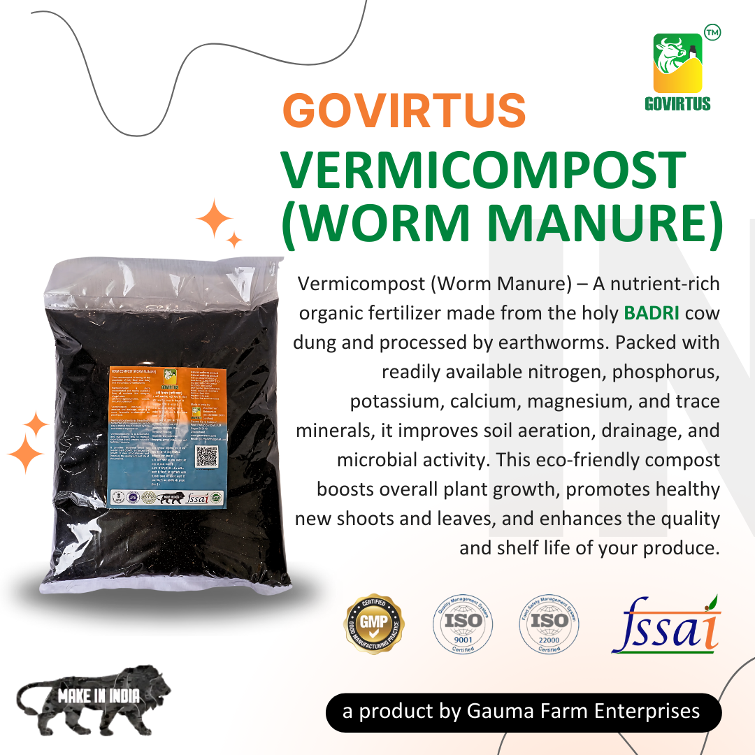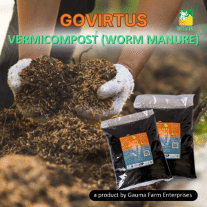 Prepared naturally from holy Badri cow dung and earthworms, Govirtus Vermicompost is a nutrient-rich, eco-friendly organic fertilizer that boosts soil fertility and plant growth. It provides essential nutrients, improves soil structure, and promotes healthy, sustainable cultivation.